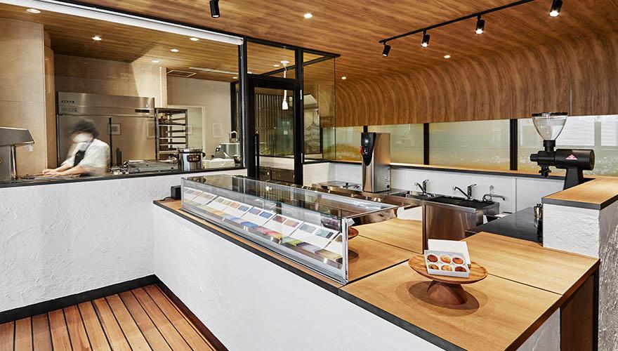 商品の生産・開発を行う工房スペースはガラス張りで、生産の様子をいつでもご覧いただけます。ショップスペースは、定番商品の「イロドリチョコレート」を中心とした展開で、手土産にも使いやすいラインナップを揃えます。またカフェスペースでは、ここでしか食べられない限定のスイーツを提供。厳選されたコーヒー(インドネシア産)・紅茶(スリランカ産)は、テイクアウトが可能です。